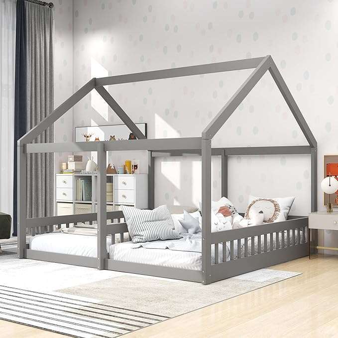 & Free ShippingMerax Double Twin Kids House Shaped Low Platform Beds, Wood Floor Bed Frame for Boys, Girls, No Box Spring Needed Easy Assemble (Twin,Grey