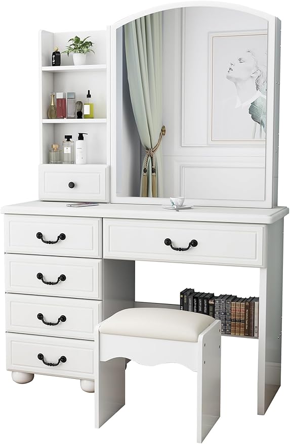 KUIKUI Vanity Desk with Mirror and Lights, Makeup Vanity Desk with Lights, Vanity Mirror with Lights Desk and Chair, 35.43”x15.35”x53.15”, 6 Drawers