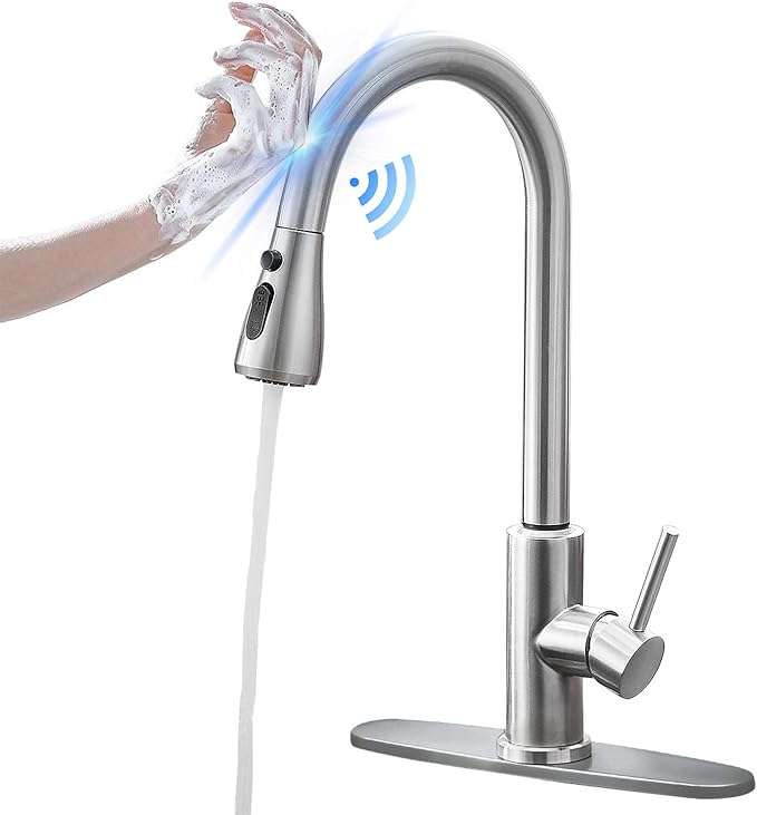 & Free ShippingQomolangma Brushed Nickel Touch Sensor Kitchen Faucet with Pull Down Sprayer, Single Handle High Arc Touch Activated Pull Out Kitchen Faucets Double Bowl Sink Faucet